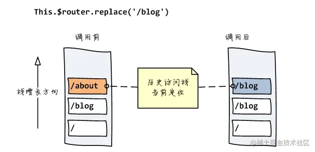 replace()方法与push()方法不同之处在于,它并不是将新路由添加到浏览器访问历史的栈顶,而是替换掉当前的路由