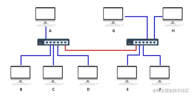 你完全不需要设计额外的东西,只需要按照之前的设计和规矩来,按照上述的接线方式即可完成所有电脑的互联,所以交换机设计的这种规则,真的很巧妙。你想想看为什么(比如 A 要发数据给 F)。