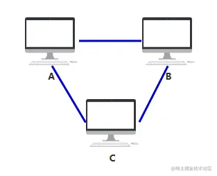 有一天,一个新伙伴 C 加入了,但聪明的你们很快发现,可以每个人开两个网口,用一共三根网线,彼此相连。