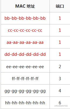 但是你要注意,上面那根红色的线,最终在 MAC 地址表中可不是一条记录呀,而是要把 EFGH 这四台机器与该端口(端口6)的映射全部记录在表中。