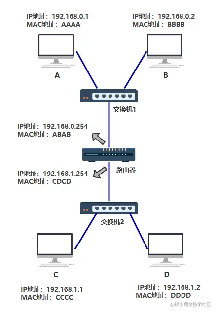 我们先给上面的组网方式中的每一台设备,加上自己的 IP 地址