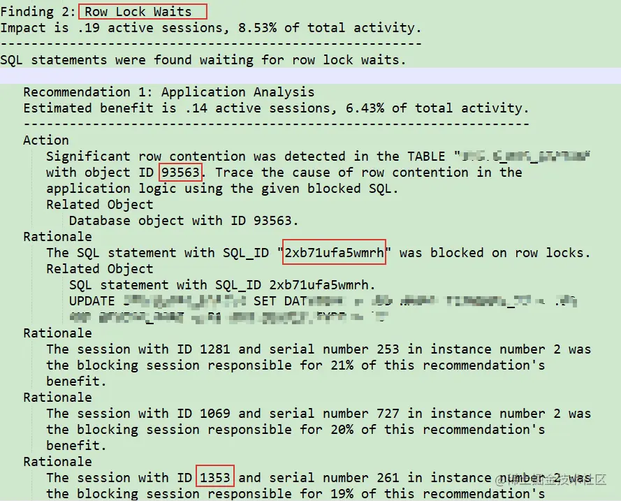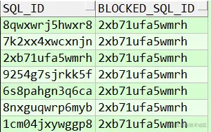 需自行替换对应的快照范围 snap_id 值,查询结果 sql_id 为被阻塞,blocked_sql_id 为阻塞 ID。