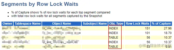 通过观察 awr 报告中段的统计信息章节 Segments by Row Lock Waits 项,可以发现发生锁的对象主要是两张表 A 和 B和 A 表的索引: