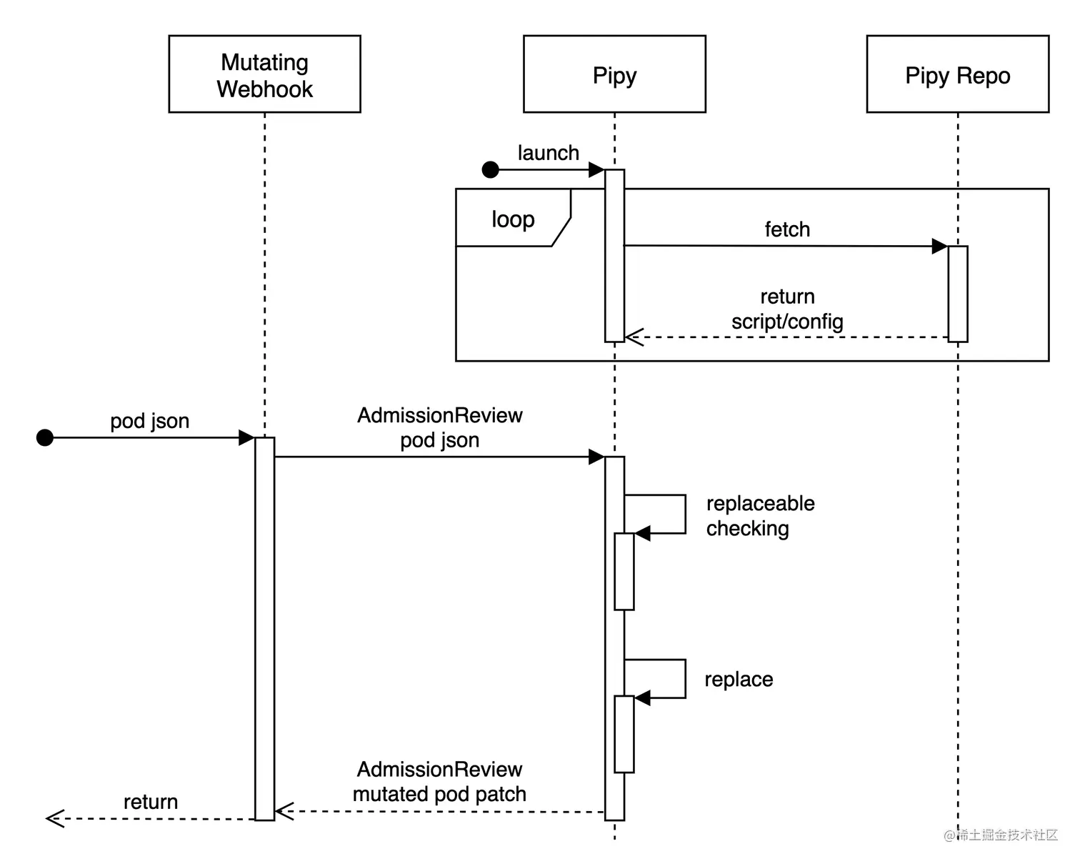 Pipy 作为应用的核心,也就是 MutatingWebhookConfiguration 的目标服务,以策略引擎的角色完成策略的执行。