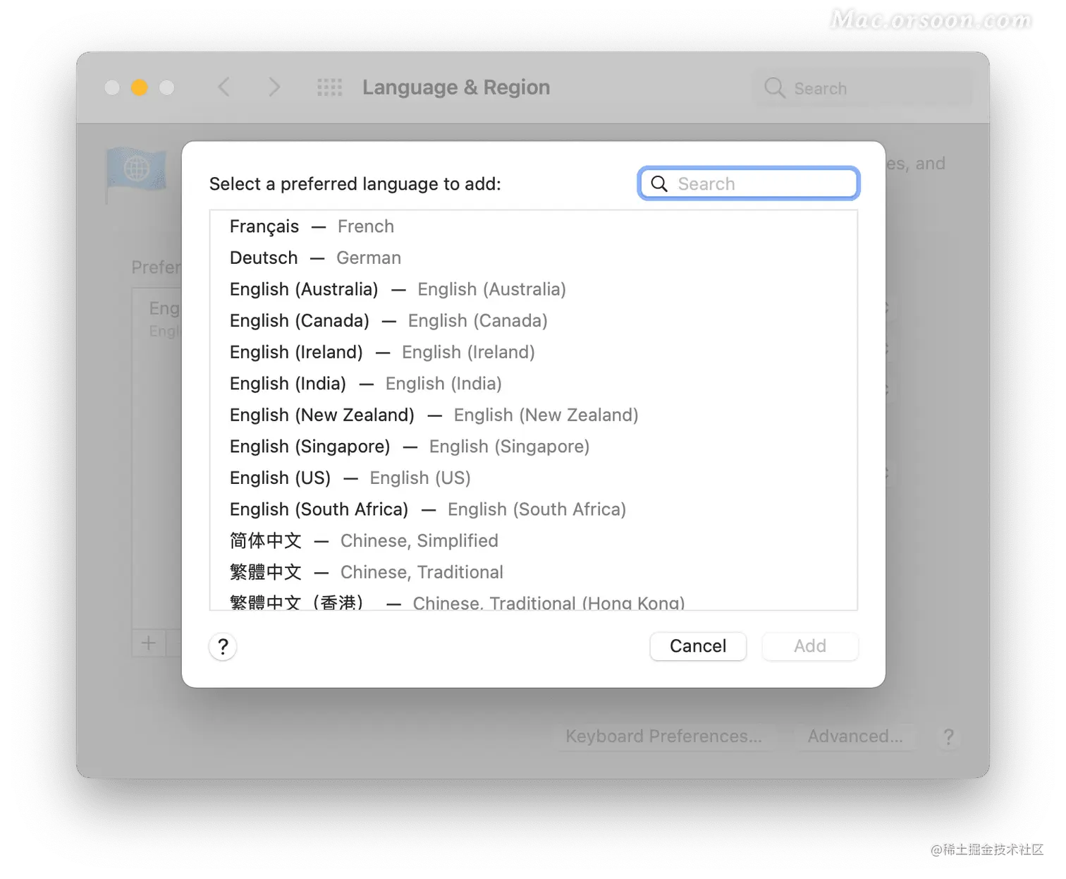 - 如果您想要的语言不在列表中,请单击“+”并从列表中选择它。按添加。