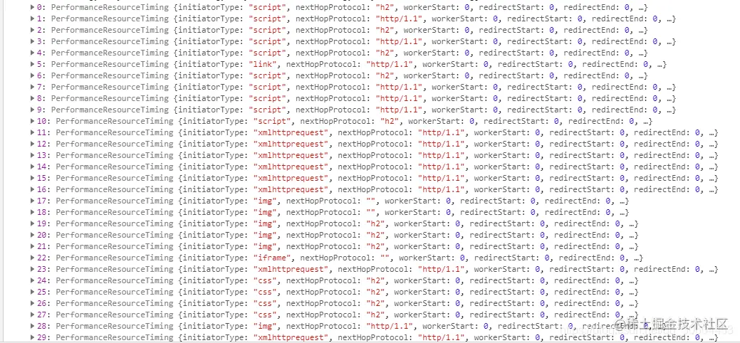 通过window.performance.getEntriesByType('resource')可以获得页面每个资源的加载详情。如下,在控制台打印一下: