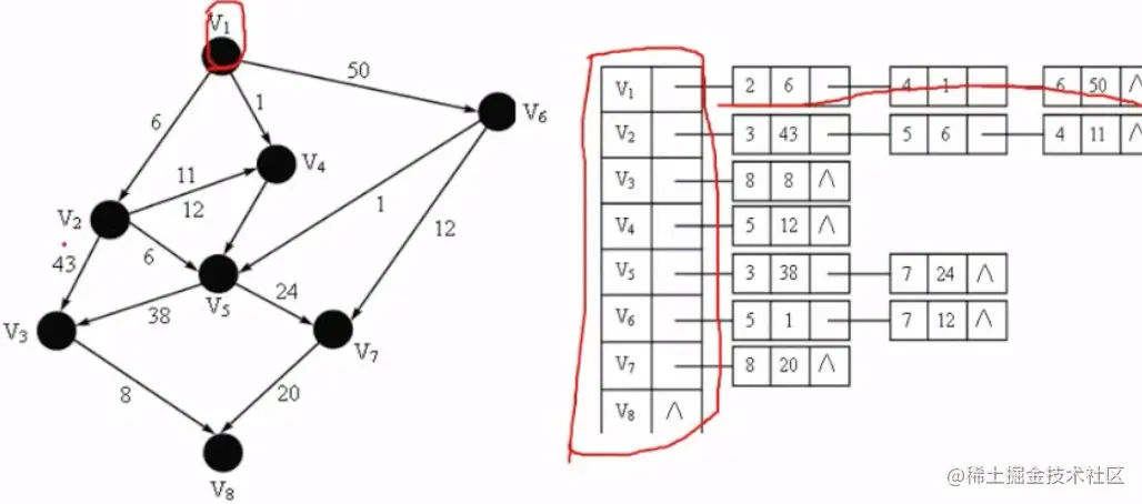 - 首先把每个顶点的邻接顶点用链表示出来,然后拥有过一维数组来顺序存储每个链表的头指针