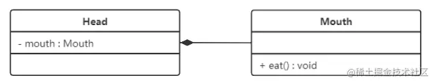 在 UML 类图中,组合关系用带实心菱形的实线来表示,菱形指向整体。下图所示是头和嘴的关系图: