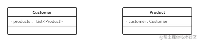 在UML类图中,双向关联用一个不带箭头的直线表示。上图中在Customer类中维护一个List<Product>,表示一个顾客可以购买多个商品;在Product类中维护一个Customer类型的成员变量表示这个产品被哪个顾客所购买。