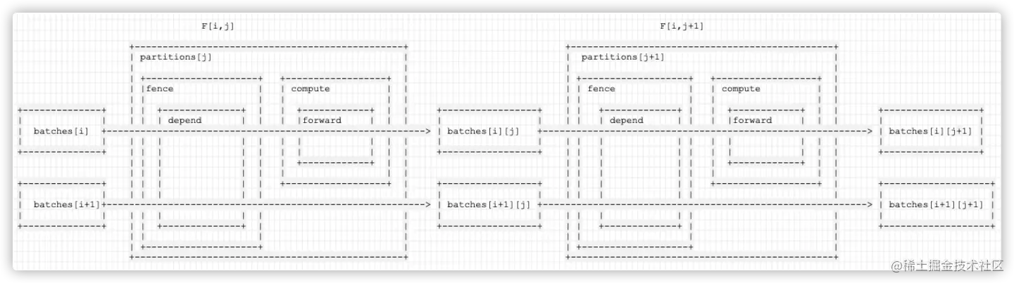 - 行间依赖是用 Join & Fork 来保证,利用空张量完成了依赖关系的设定,确保 batches[i-1] 在 batches[i] 之后完成。PermuteBackward 协助完成了这个依赖操作。