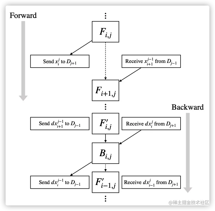 - 管道并行的策略是根据分区索引 j 分配任务,以便第 j 个分区完全位于第 j 个设备中。