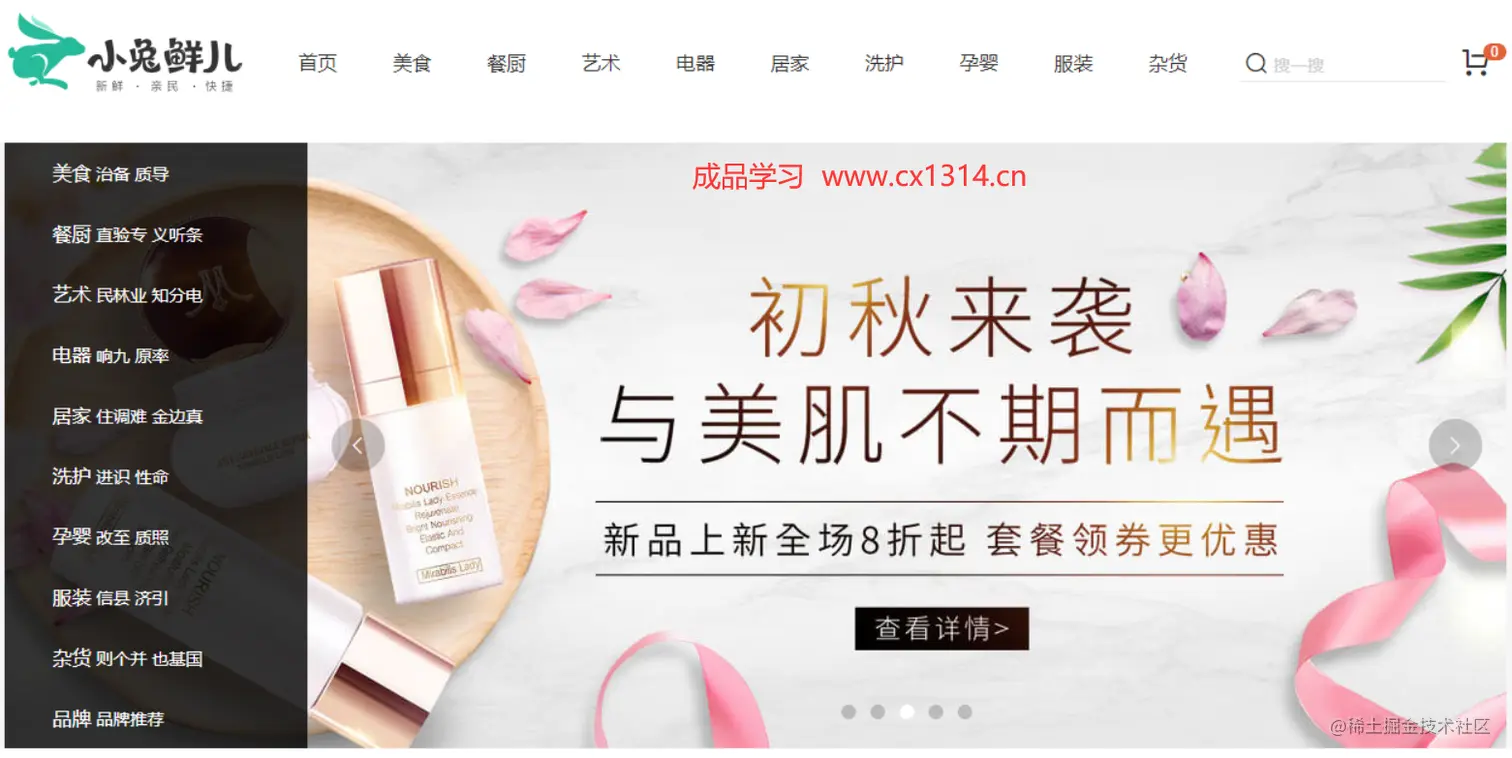 小兔鲜儿Vue3.0实现了电商平台主线业务功能,电商首页、一级分类、二级分类、商品详情、购物车、结算、支付、个人中心、订单管理、订单详情。