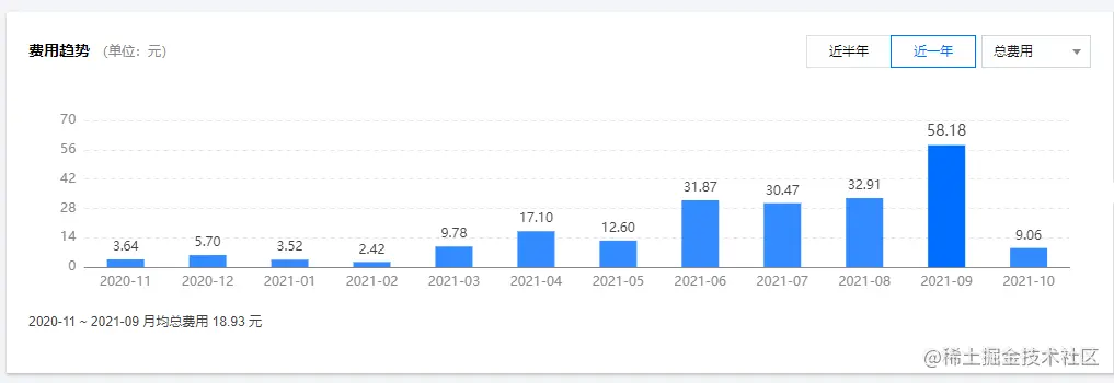 我的图床用的是腾讯云的对象存储,是按流量收费,下面就是我每个月在图床上的消费,整体还是很便宜的: