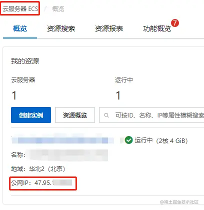 然后你就可以登录阿里云控制台,找到云服务器 ECS 的选项,看到自己的公网IP:
