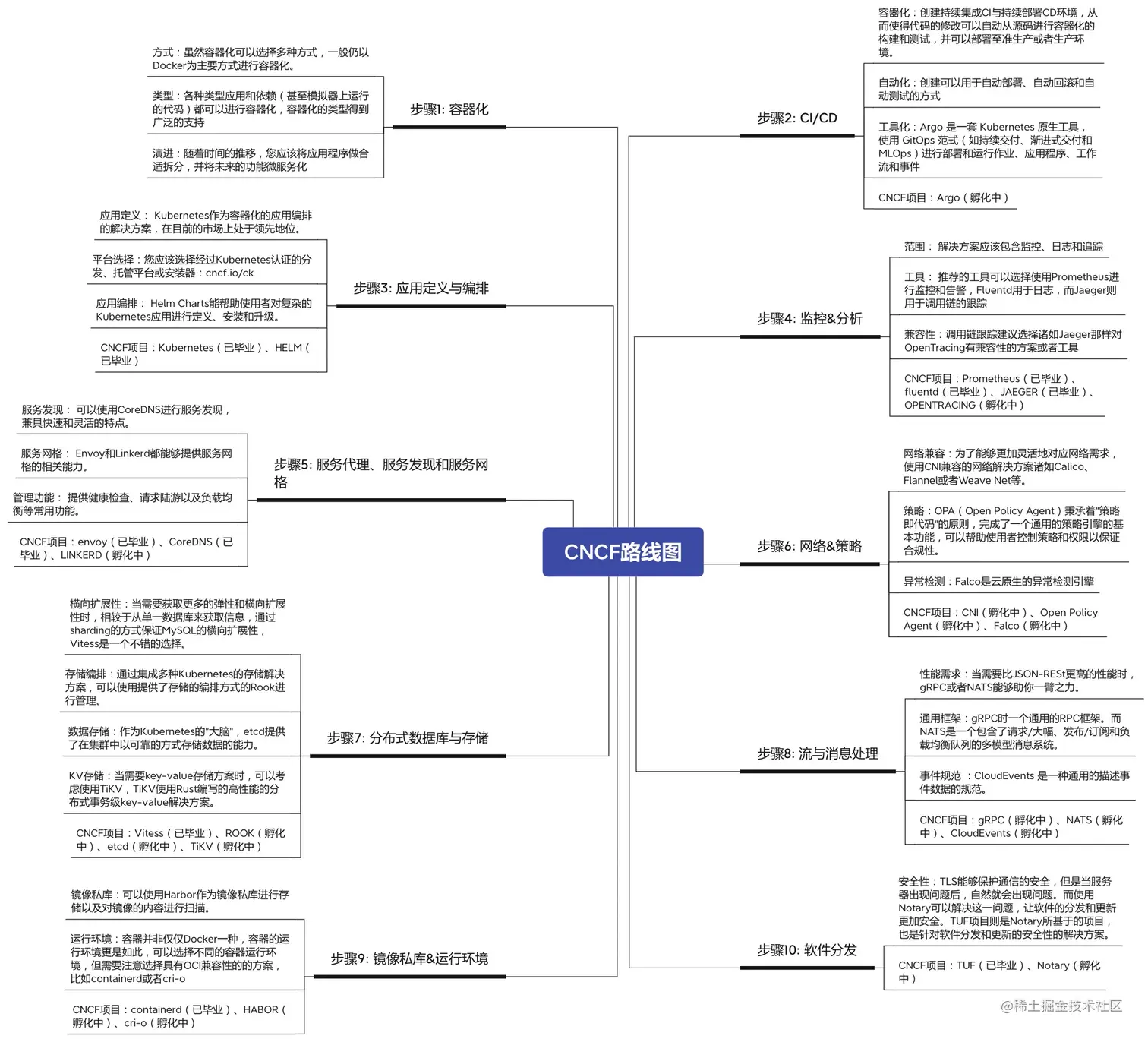 CNCF 为了帮助企业和机构在复杂的基础架构之上更好落地云原生应用,从整体上给出了十个具体实施步骤,在不同的步骤都可以结合 Landscape 中列出的产品或服务进行选择。以下是 CNCF 给出的云原生实践路线图: