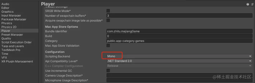 在PlayerSettings面板 --> Player --> OtherSettings 下 Scripting Backend设置为Mono: