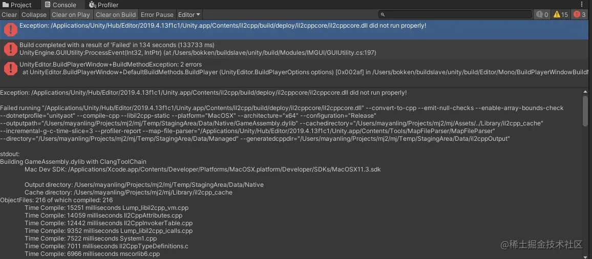 停一会之后,报错信息如下: Exception: /Applications/Unity/Hub/Editor/2019.4.13f1c1/Unity.app/Contents/il2cpp/build/deploy/il2cppcore/il2cppcore.dll did not run properly!