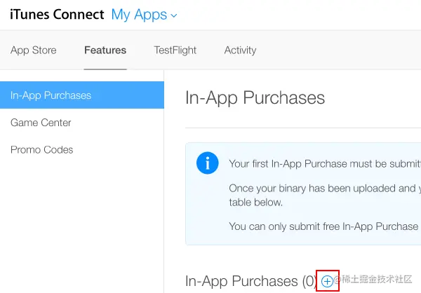 选择功能并使用加号 ("+") 按钮添加新的应用内购买: