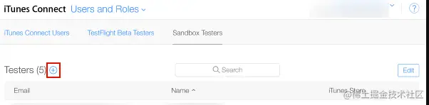 iTunes Connect创建沙盒测试器以在您的测试设备的iTunes帐户上使用。为此,请导航至iTunes Connect > Users and Roles,然后选择加号 ("+") 按钮。