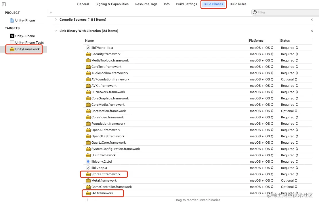 不写上面代码的话,打包出Xcode工程后,需要手动添加StoreKit.framework和iAd.framework: