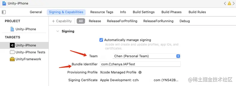 Bundle Identitifier和Team与iTunes Connect中使用的一致 PS:Unity中的包名也应该保持一致