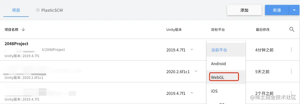 若你已经有了预发布的项目那么就直接把目标平台修改为”WebGL“ 然后打开项目即可;