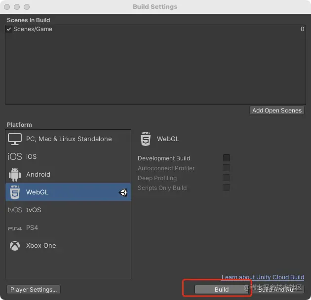 若你的项目没有按照第一步的方式使用”WebGL”平台打开,那么需要在工程中“Build Settings...” --> 弹出面板选择“WebGL” --> 点击“Switch Platform” 等待切换平台完成即可: