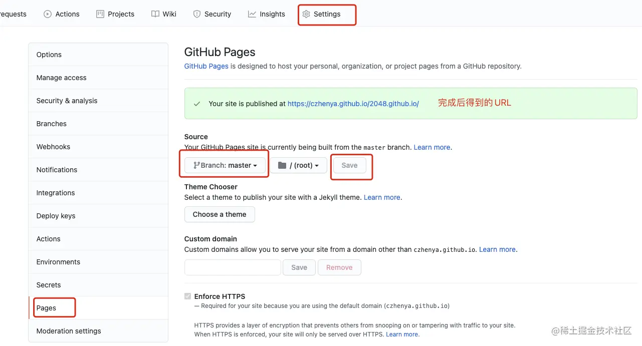 在GitHub上选择“Settings” --> 左侧标签栏选择“Pages” --> 然后将"Source"设置为“master” --> 最后点击右侧“Save”保存,等网页刷新完成,即可看到下图带颜色背景框部分的URL,点击此URL,即可访问。