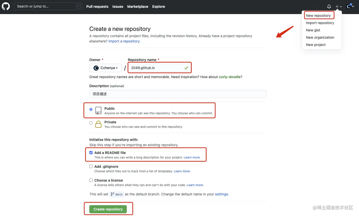 登陆GitHub官网(打不开的话需要Fan墙),点击右上角“+”,选择“New repository” 然后弹出如下界面,进行创建项目配置,图中红框分别表示:项目名称,设置为共开(这样别人才能访问到),带描述文件,最后点击下面的创建按钮: