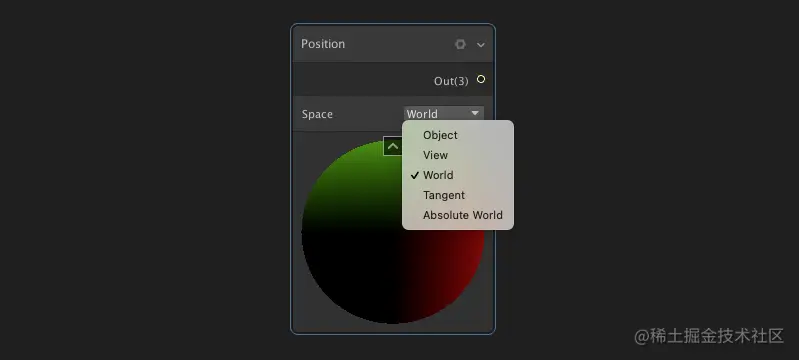 位置节点:提供了一个接口,来访问模型顶点信息,可以通过Space的选项获取对应的坐标空间。
