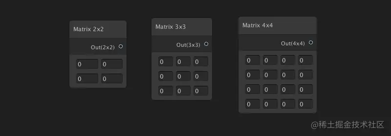 矩阵节点:定义一个2x2,3x3,4x4 的矩阵。通常用来计算平移,旋转,缩放。