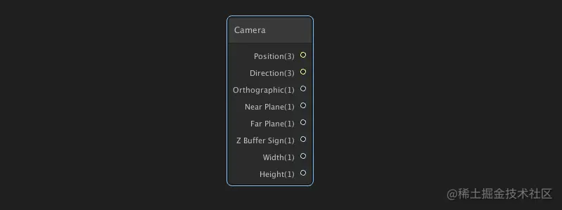 相机节点:提供对当前渲染的相机各种参数访问,这由Camera的 GameObject的值组成,包括:位置,方向,正交(是正交返回1,否则返回0),近/远平面,Z轴缓冲区标志(使用反向Z缓冲返回-1,否则返回1),宽/高度(正交模式下才有)。