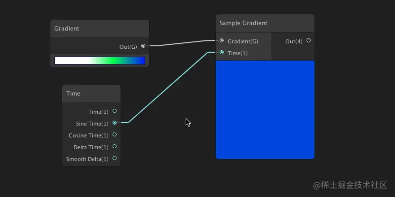 采样渐变色节点:通过输入渐变色节点和时间节点,我们可以得到一个随时间变化的动态颜色。时间节点的0-1代表着渐变色节点的从左到右的颜色取值。