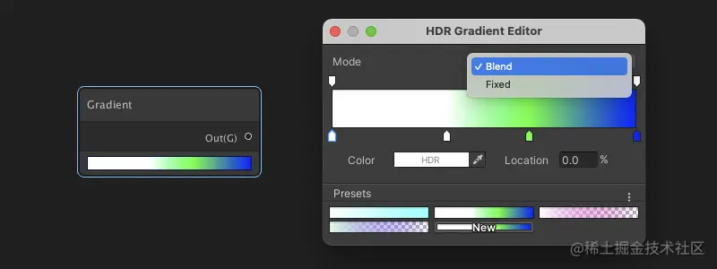 渐变色节点:定义输入渐变颜色。自定义编辑器分为:Blend 混合模式 和 Field 整数模式。