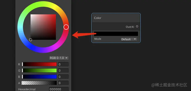 颜色节点:定义一个指定颜色的思维变量,点击颜色区域会弹出颜色编辑面板,分为Default和HDP两种模式。