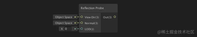 反射探针节点:提供对距离对象最近的反射探针检测器的访问。通用渲染管线(URP)支持,高清渲染管线(HDRP)不支持此节点。