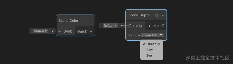 场景深度节点(Scene Depth): 使用输入UV提供对当前Camera深度缓冲区的访问,该输入应为标准化屏幕坐标。 深度采样模式: