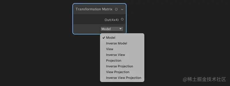 - 视图投影,代码: float4x4 _TransformationMatrix_Out = UNITY_MATRIX_VP;