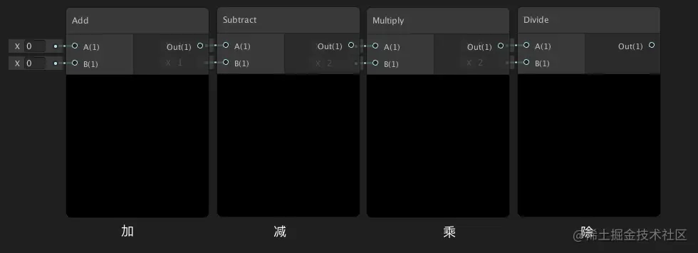 加减乘除节点:返回两个输入值的和/差/积/商。