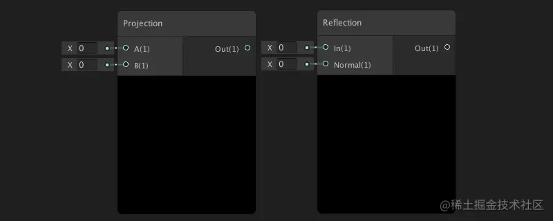 倒数平方根节点(Reciprocal Square Root):返回1除以输入值的平方根结果。比如:输入9,输出1/3。