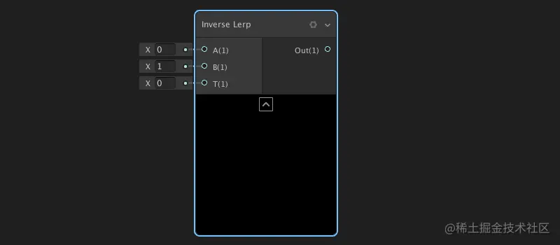 逆线性差值节点:返回通过输入T在输入A和B之间的逆线性差值的结果。就是字面意思和线性差值的结果反过来。比如当T为0时,则输出为B;T为1时,输出为A。