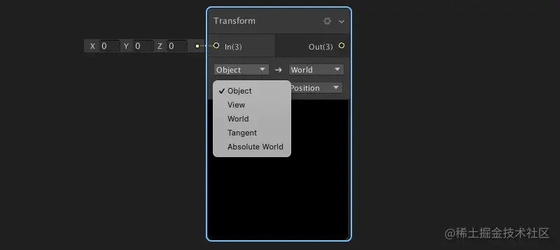 可选择从对象,视图,世界,切线,绝对世界空间之间进行转换。