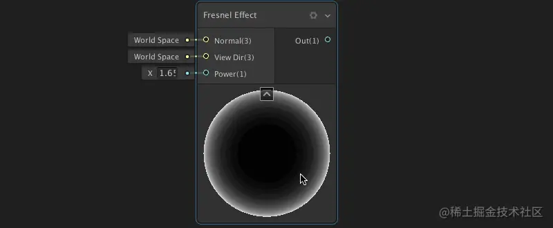 菲涅尔效果:是根据视角在表面上产生不同反射率的效果,当您接近掠射角时,反射的光更多。菲涅尔效应节点通过计算表面法线和视图方向之间的角度接近此。这个角度越大,返回值就越大。