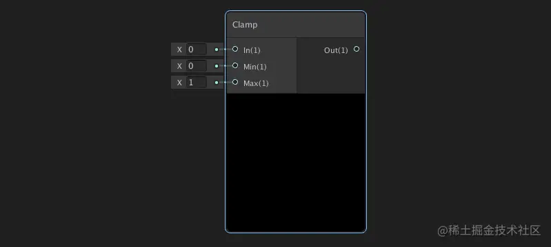 夹子(范围)节点:返回分别有Min和Max定义的最小值和最大值之间的值。若输入值在最大最小值之间,则之间输出输入值;若输入值小于最小值 或 大于最大值,则输出最小值 或 最大值。
