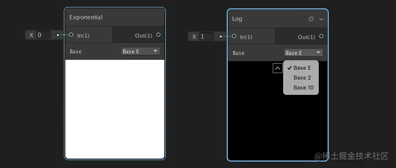 对数节点(Log):对数是对求幂的逆运算。 Base下拉选项: