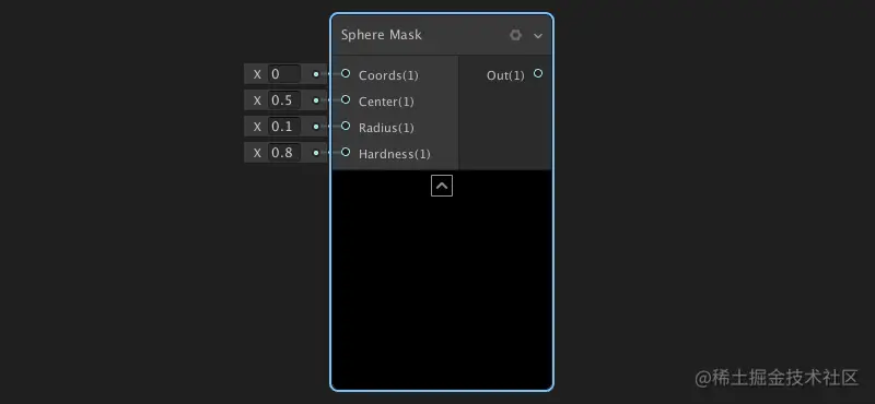 球面遮罩节点:创建源自输入Center的球面遮罩。球体使用距离计算并用半径和硬度输入修改。