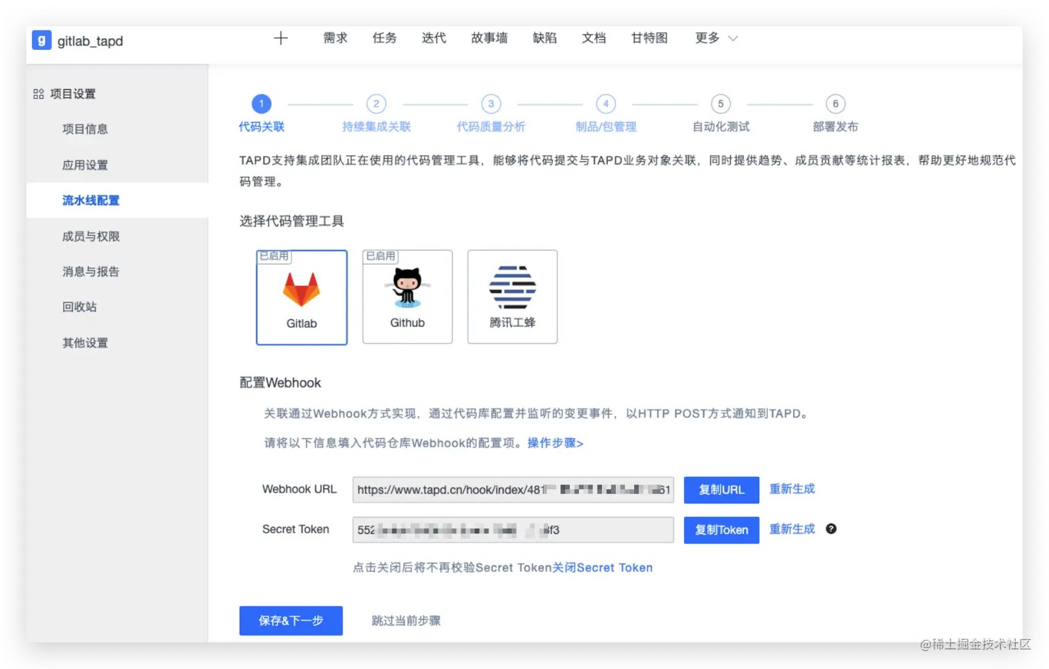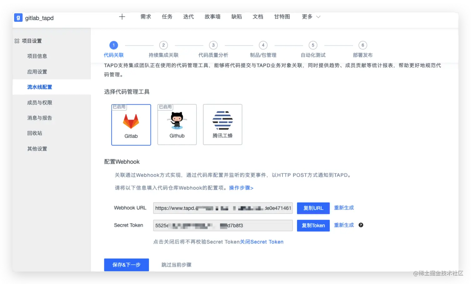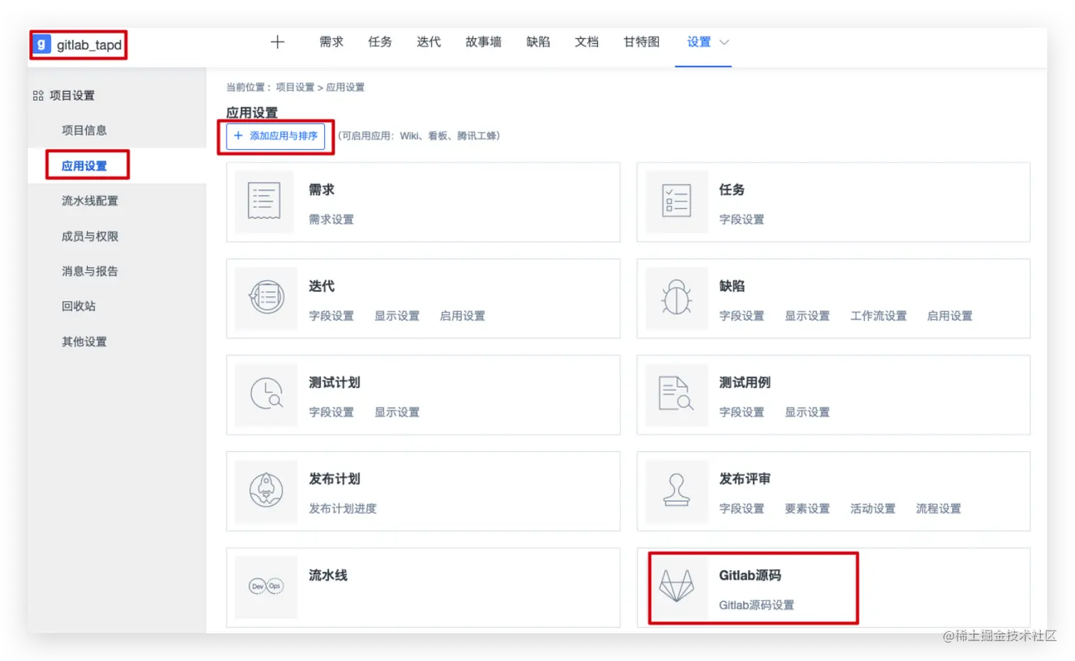 - 在Tapd的项目中的应用配置->添加应用->Gitlab源码