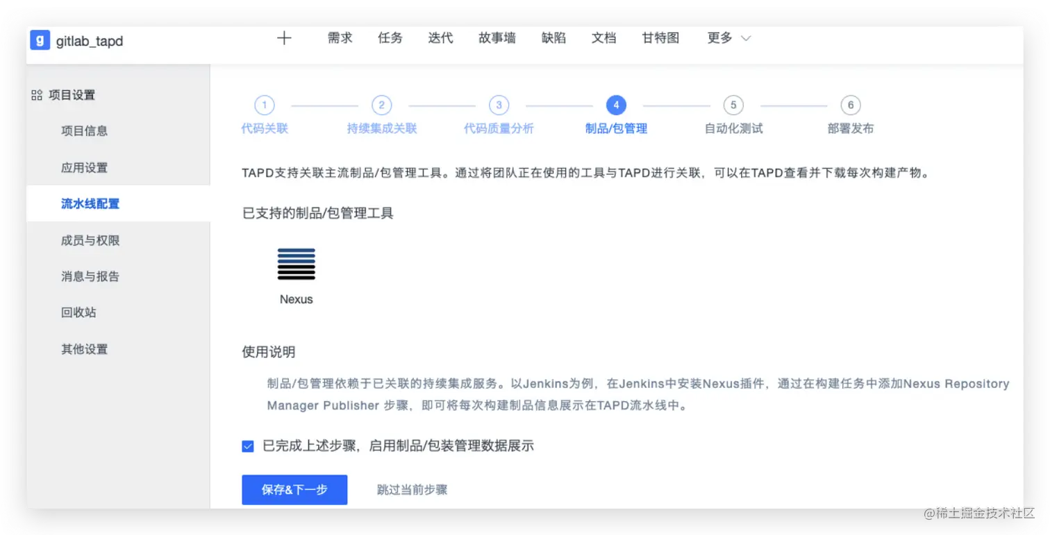 制品/包管理依赖于已关联的持续集成服务。以Jenkins为例,在Jenkins中安装Nexus插件,通过在构建任务中添加Nexus Repository Manager Publisher 步骤,即可将每次构建制品信息展示在TAPD流水线中。