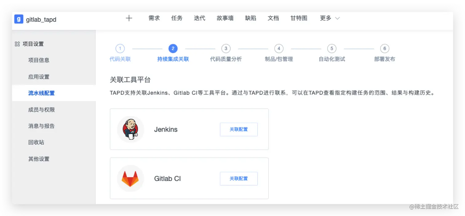 关联工具平台,TAPD支持关联Jenkins、Gitlab CI等工具平台。通过与TAPD进行联系,可以在TAPD查看指定构建任务的范围、结果与构建历史。
