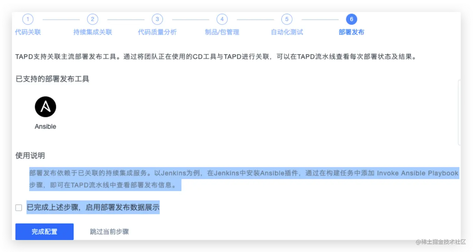 部署发布依赖于已关联的持续集成服务。以Jenkins为例,在Jenkins中安装Ansible插件,通过在构建任务中添加 Invoke Ansible Playbook步骤,即可在TAPD流水线中查看部署发布信息。